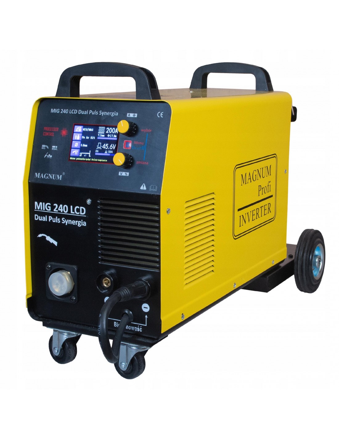 Urządzenie MAGNUM MIG 240 DUAL PULS SYNERGIA LCD jest lekkim przenośnym półautomatem spawalniczym zasilanym z sieci jednofazowej 230V o maksymalnym prądzie spawania 200A. Spawarka MIG 240DP LCD przeznaczona jest przede wszystkim do spawania materiałów wykonanych ze stali nierdzewnej i aluminium a także stali niskowęglowych, niskostopowych oraz stali wysoko stopowych.